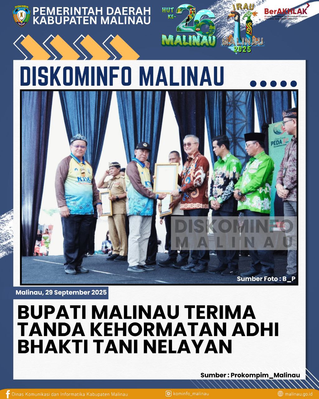 Tarakan, 29 September 2025. Bupati Malinau, Wempi W. Mawa, S.E., M.H., menerima Tanda Kehormatan Adhi Bhakti Tani Nelayan dari Kontak Tani Nelayan Andalan (KTNA) Kalimantan Utara. Penghargaan ini diberikan atas jasa besar beliau dalam mendorong kemajuan sektor pertanian dan perikanan di Kabupaten Malinau maupun Kalimantan Utara.