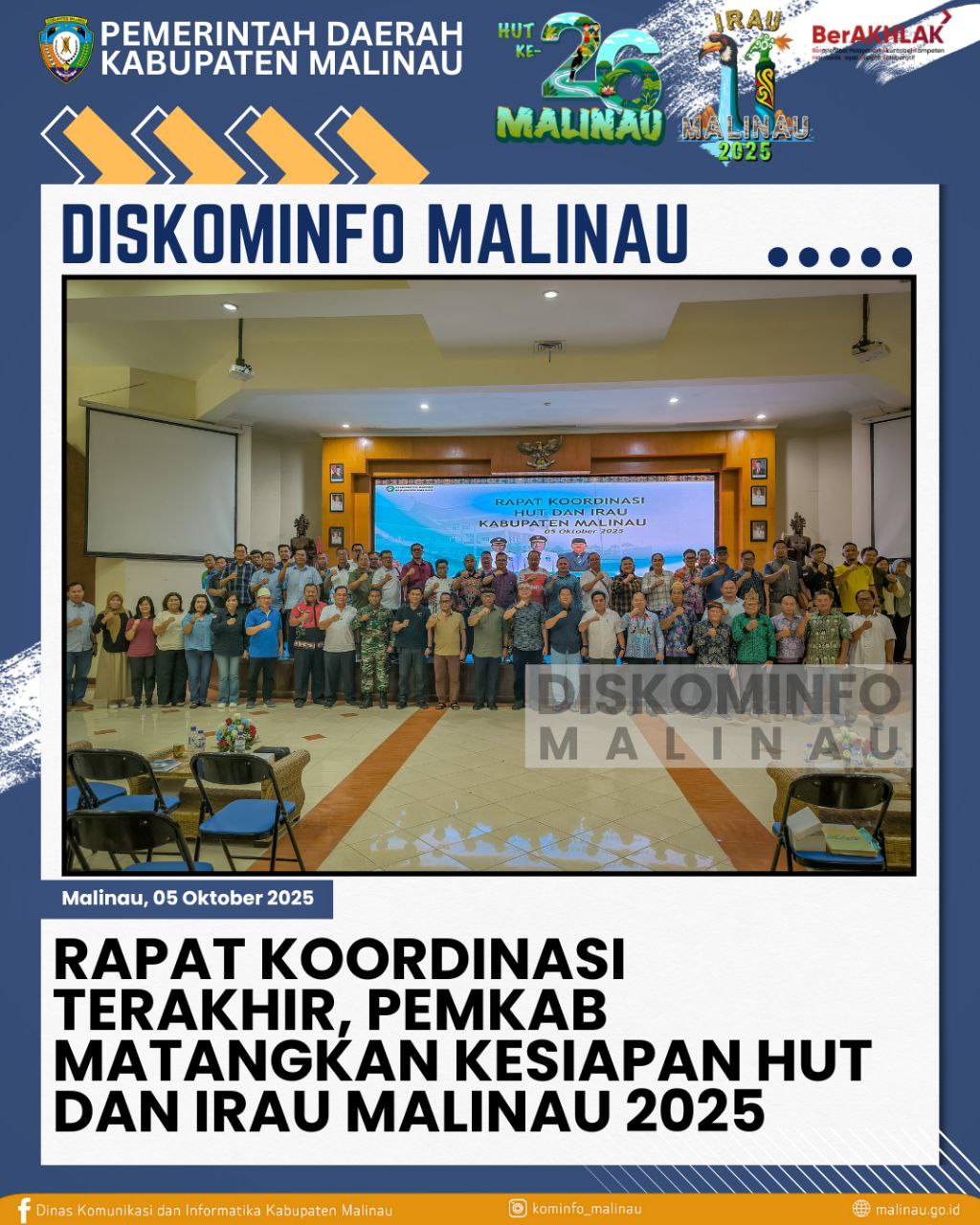 06 Oktober 2025Malinau – Menjelang pelaksanaan puncak Hari Ulang Tahun ke-26 Kabupaten Malinau dan Festival Budaya IRAU ke-11 tahun 2025, Pemerintah Kabupaten Malinau menggelar rapat koordinasi terakhir di ruang Laga Feratu, Minggu (5/10/2025).